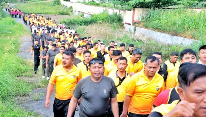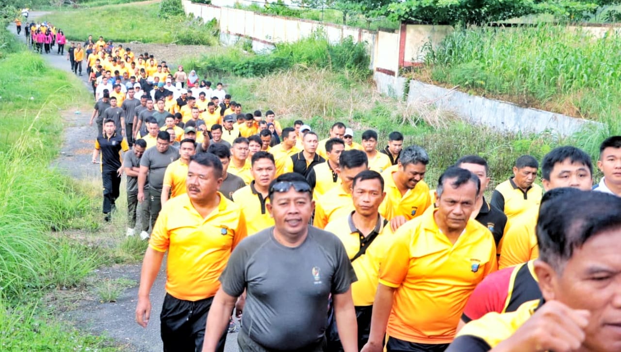 Tampak dalam gambar peserta peserta gerak jalan santai hari Bhayangkara Tahun 2025 oleh Polres Simalungun.