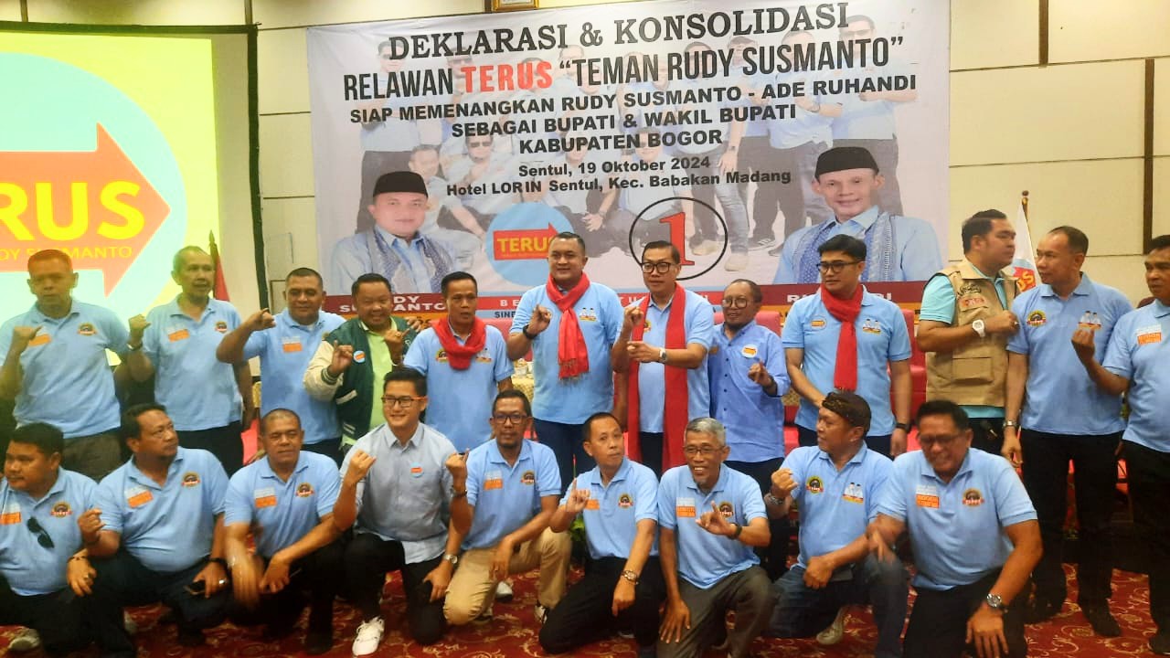Suaraaksirakyat.com, Kabupaten BOGOR,- Jelang Pilkada 2024 November mendatang Relawan TERUS menggelar deklarasi dan konsolidasi siap memenangkan pasangan Rudy Susmanto – Jaro Ade, sebagai bupati dan wakil bupati kabupaten bogor di Hotel Lor Inn Sentul, kecamatan Babakan Madang, Kabupaten Bogor, Sabtu (19/10/2024)