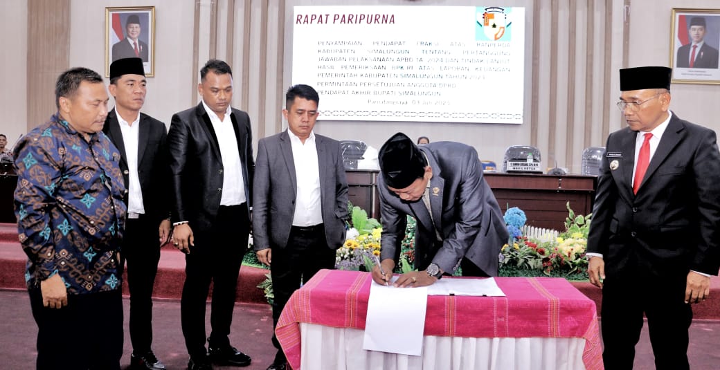 DPRD Kabupaten Simalungun menyetujui Rancangan Peraturan Daerah (Ranperda) tentang Pertanggungjawaban Pelaksanaan APBD Tahun Anggaran (TA) 2024 dan tindak lanjut hasil pemeriksaan BPK-RI atas Laporan Keuangan Pemerintah Kabupaten (Pemkab) Simalungun TA 2024.
