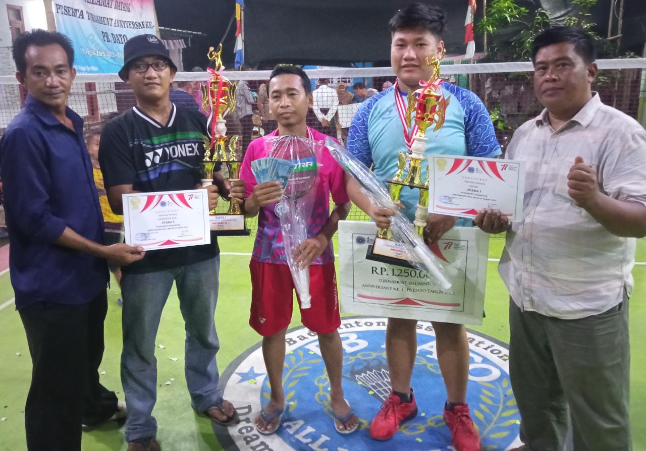 “Maka dari itu yang dapat menjuarai Final Turnamen Badminton PB Dato 2022 ini yang Juara 1 diberikan Hadiah sebesar (1.250.000) Ribu, Juara 2 (750.000) Ribu, Juara 3 (500.000) dan semua Masing-masing Juara mendapatkan Sepasang Raket, Piagam dan Medali dan sekali lagi saya sangat berterima kasih banyak kepada Kepala Desa Lemo (Satria) yang telah turut hadir dalam acara Turnamen Badminton PB Dato 2022.