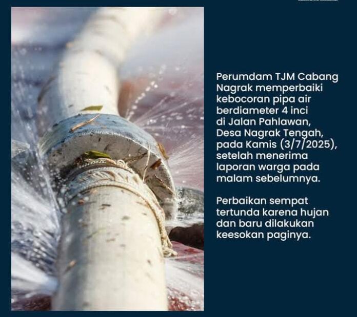 suaraaksirakyat.com, Kabupaten Sukabumi,- Perusahaan Umum Daerah Air Minum (Perumdam) Tirta Jaya Mandiri (TJM) Cabang Nagrak melakukan perbaikan kebocoran pipa distribusi air berdiameter 4 inci di Jalan Pahlawan, Desa Nagrak Tengah, Kecamatan Nagrak, Kabupaten Sukabumi, Kamis (3/7/2025).