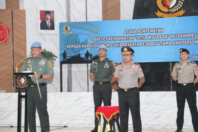 Komandan Paspampres Mayjen TNI Achiruddin, S.E., M. Han. menyematkan langsung brevet untuk Kapolda Metro Jaya.