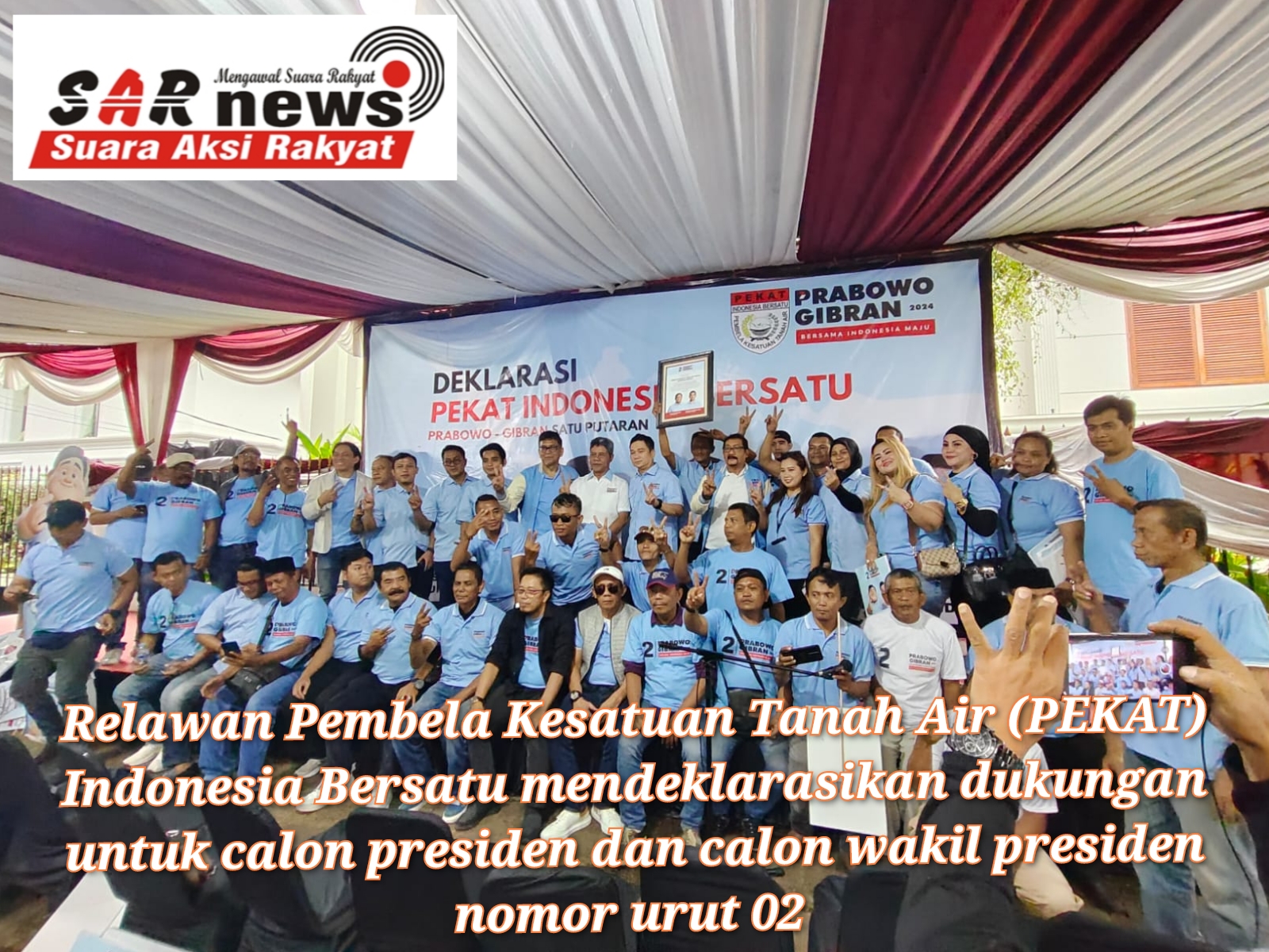 Relawan Pembela Kesatuan Tanah Air (PEKAT) Indonesia Bersatu mendeklarasikan dukungan untuk calon presiden dan calon wakil presiden nomor urut 02 Prabowo Subianto-Gibran Rakabuming Raka di Pilpres 2024.
