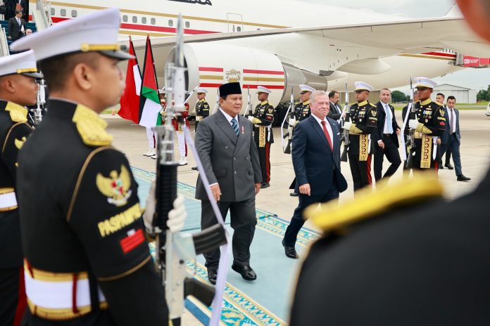 Prabowo menyambut kedatangan Raja Kerajaan Yordania Hasyimiyah, Abdullah II Ibn Al Hussein, di Lanud Halim Perdanakusuma