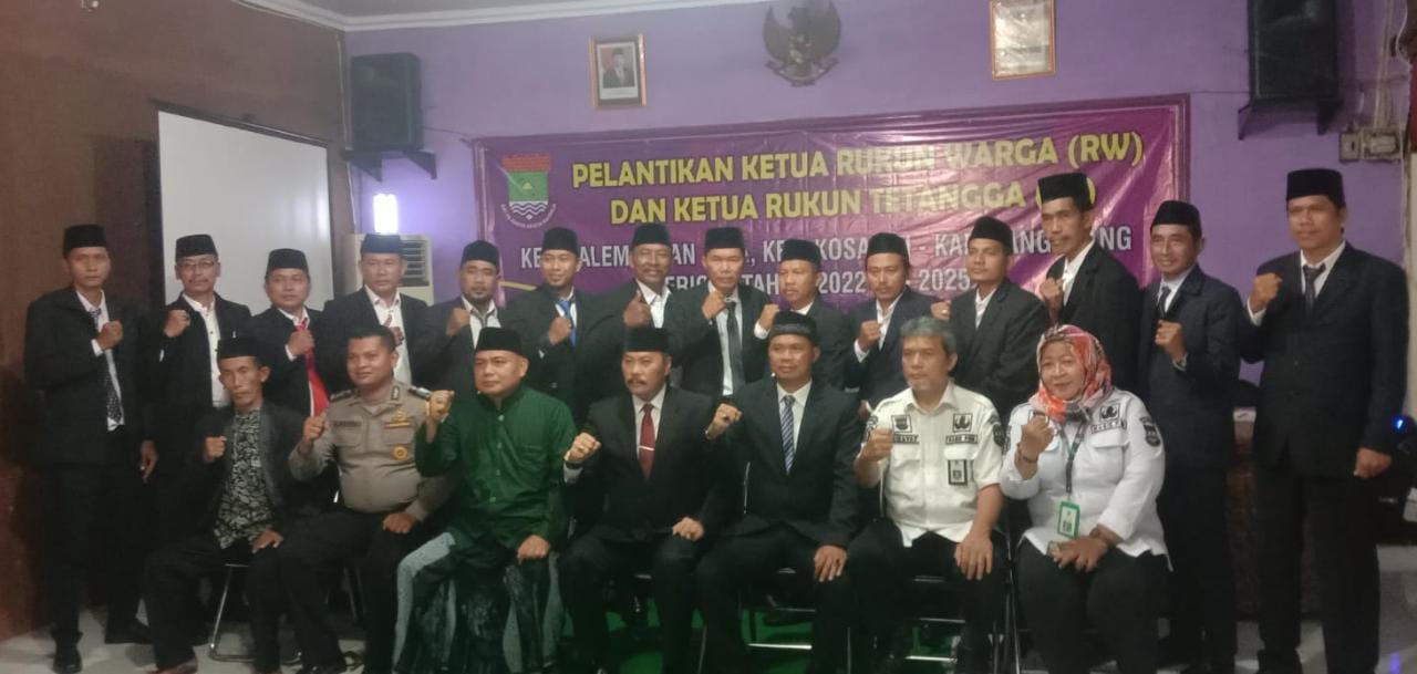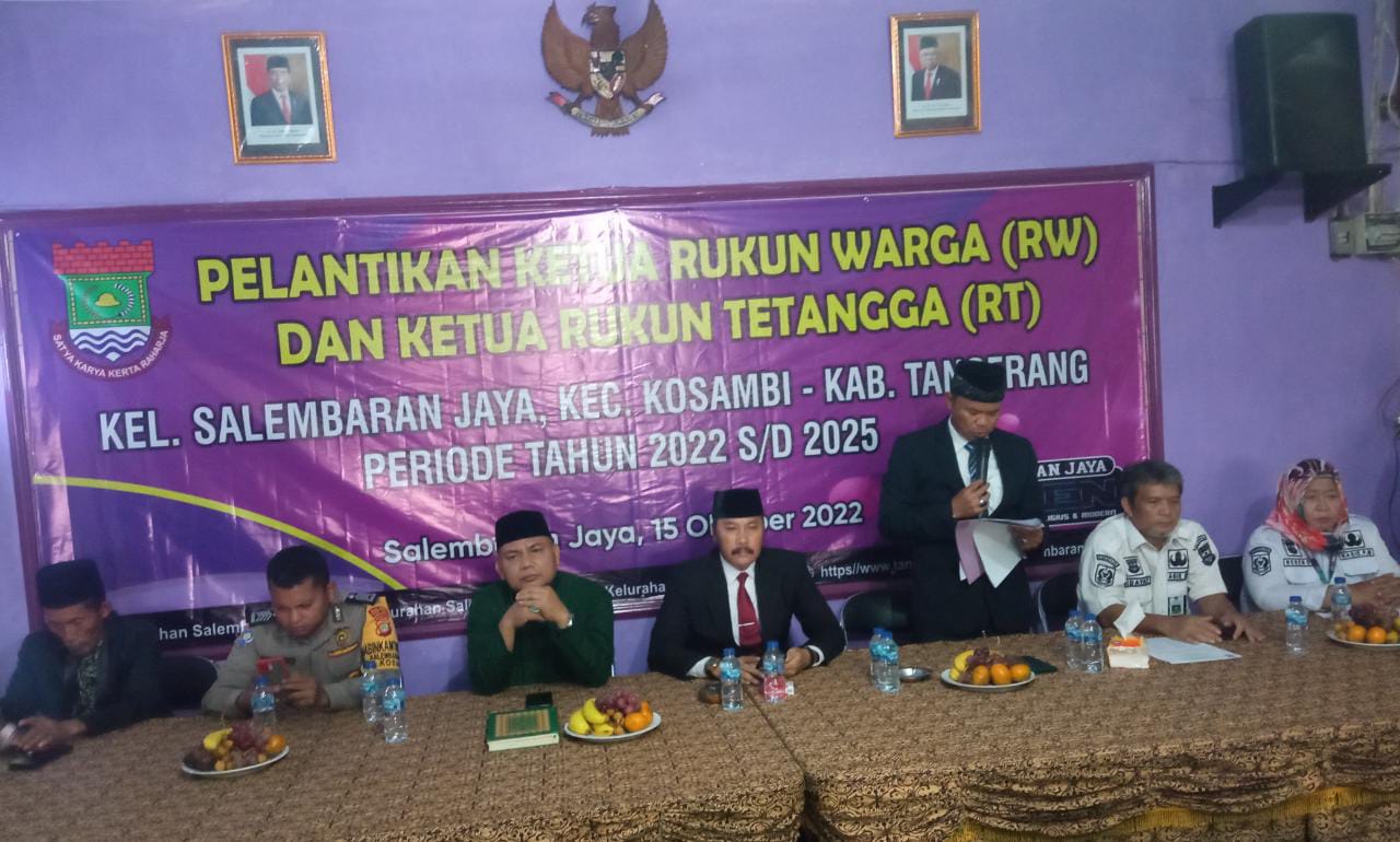 Sebanyak 60 Ketua Rukun Tetangga (RT) dan 14 Ketua Rukun Warga (RW) Se Kelurahan Salembaran Jaya dilantik secara serentak. Selain pelantikan para Ketua RT dan RW yang purna jabat juga diberikan penghargaan atas masa baktinya, di Aula Kantor Kelurahan Salembaran Jaya, Kecamatan Kosambi, Kabupaten Tangerang, Sabtu (15/10/2022).