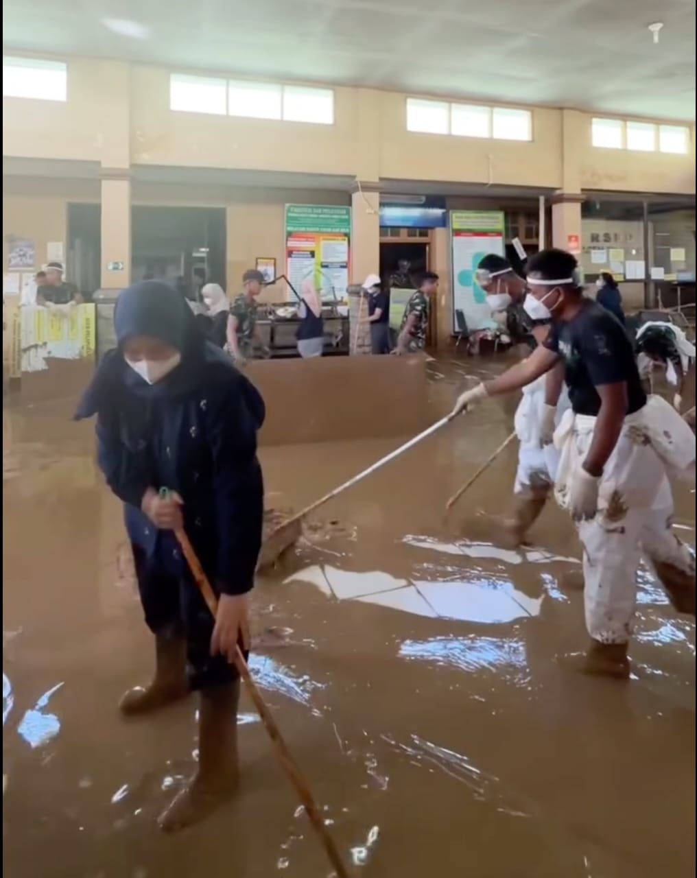 Dalam video tersebut, relawan dari berbagai lapisan masyarakat bekerja sama bersama personel TNI membersihkan sisa-sisa lumpur dan air banjir, baik di dalam maupun di luar area rumah sakit.