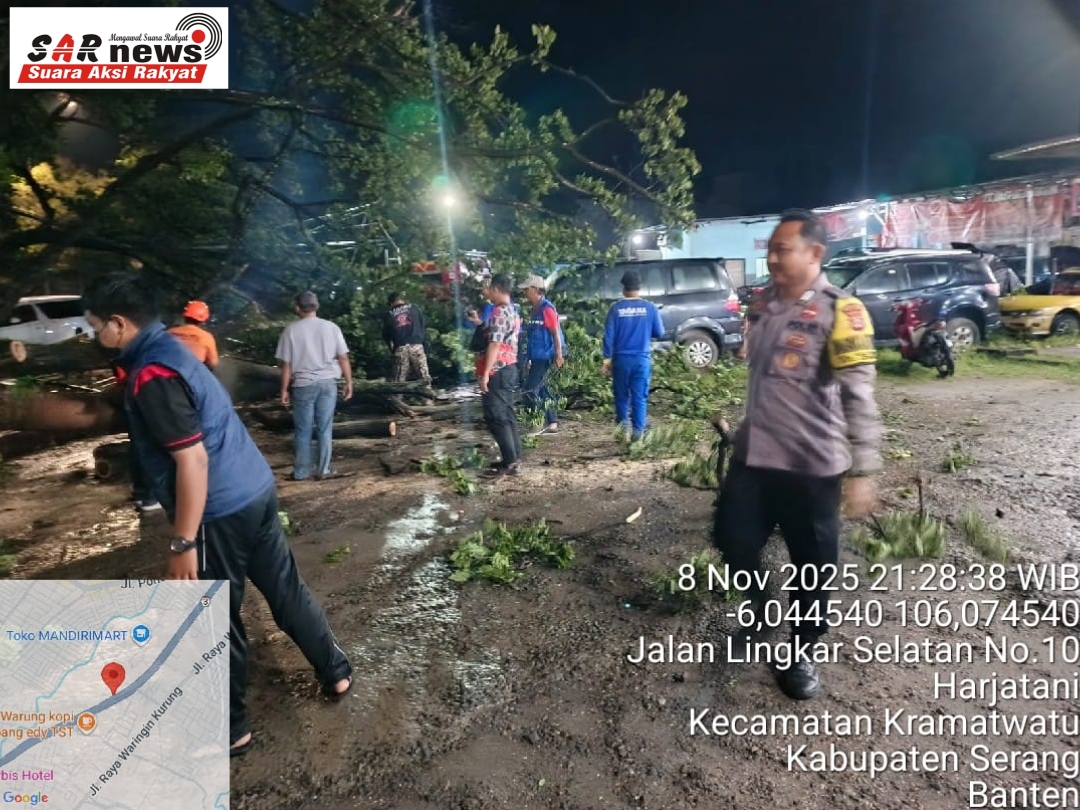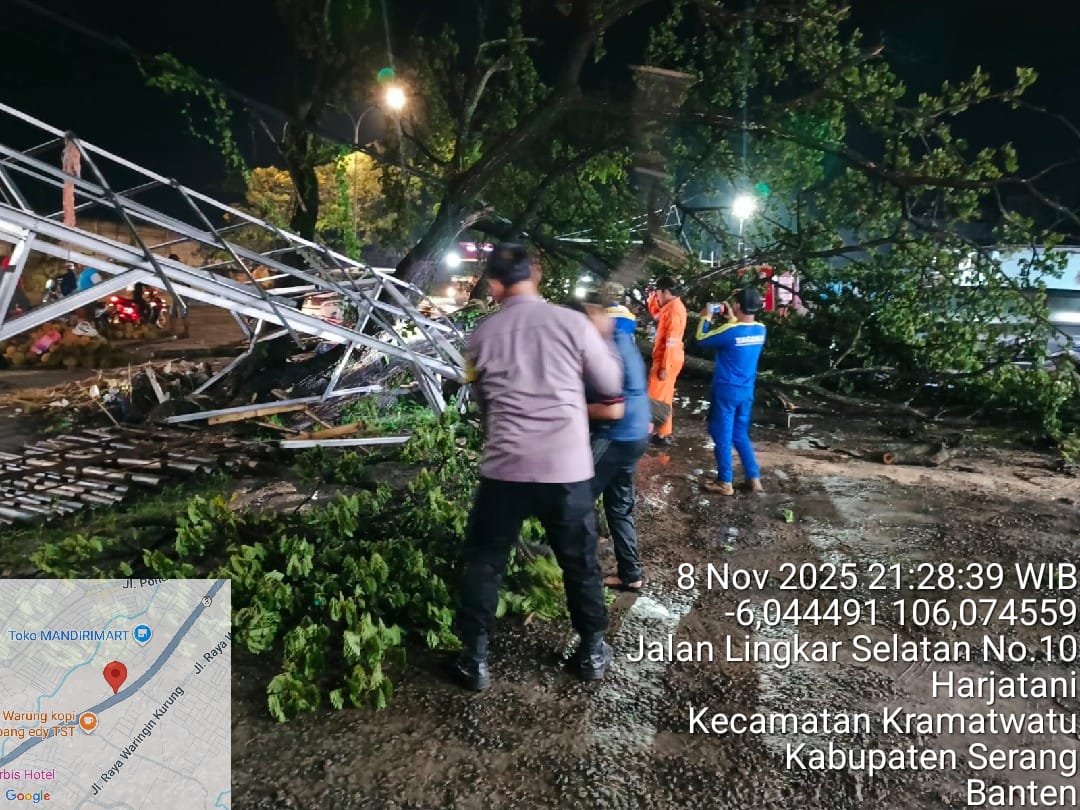 Sebuah pohon trembesi berukuran besar tumbang dan menimpa jaringan kabel listrik serta kabel optik di Jalan Lingkar Selatan, tepatnya di depan Warung Makan Bebek Purnama, Kampung Cigodag, Kelurahan Harjatani, Kecamatan Keramatwatu, Kota Serang, pada Sabtu (8/11/2025) malam.