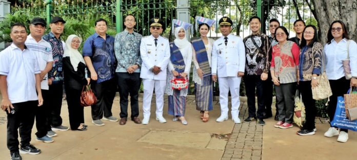 Bupati Simalungun DR H Anton Achmad Saragih didampingi istri Ny Hj. Darmawati Anton Achmad Saragih dan Wakil Bupati Simalungun Benny Gusman Sinaga, ST yang juga didampingi istri Ny Rospita Benny Gusman Sinaga, usai mengikuti prosesi pelantikan kembali menuju halaman Monas.