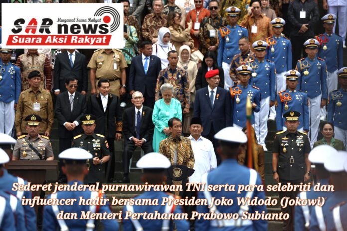 Sederet jenderal purnawirawan TNI serta para selebriti dan influencer hadir bersama Presiden Joko Widodo (Jokowi) dan Menteri Pertahanan Prabowo Subianto saat peresmian gedung graha utama Akademi Militer (Akmil) di Kabupaten Magelang, Jawa Tengah, Senin (29/1).