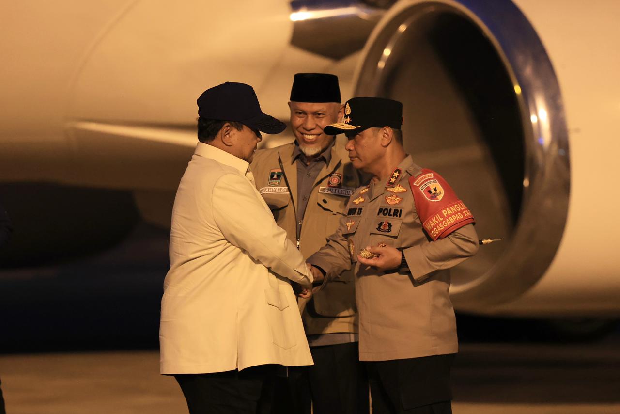 Presiden Republik Indonesia Prabowo Subianto tiba di Bandara International Minangkabau, Kabupaten Padang, Pariaman, Provinsi Sumatra Barat pada pukul 18:30 wib, Rabu (17/12/25).