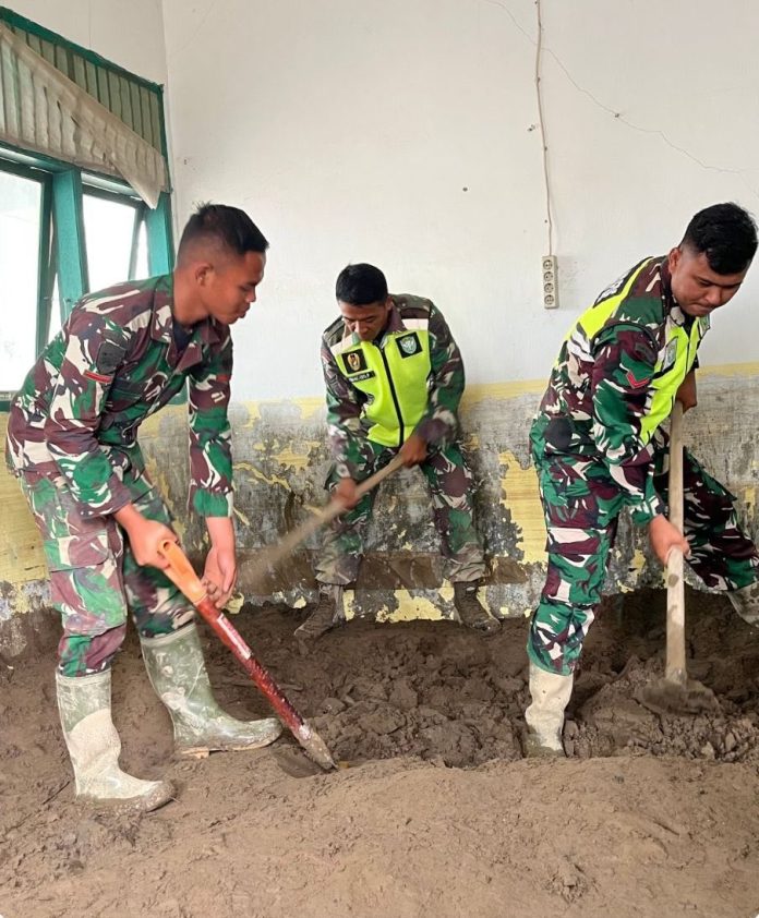 Pondok Bersalin Desa (Polindes) di Desa Mancang, Aceh Utara, mulai dibersihkan dari sisa lumpur dan material sampah akibat banjir dan longsor. Satgas Penanggulangan Bencana Alam (Gulbencal) Yonif TP 857/GG bersama personel Kodim 0102/Pidie Jaya bahu-membahu membersihkan fasilitas layanan kesehatan publik ini agar bisa kembali beroperasi optimal.